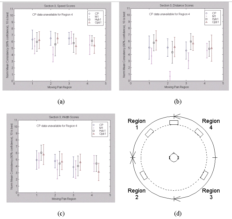 Fig. 4.12. Section 3 Results: Scores for (a) speed, (b) distance, (c) width, (d) moving pan regions.