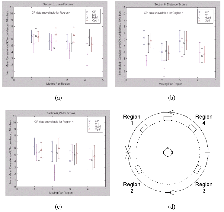 Fig. 4.15. Section 6 Results: Scores for (a) speed, (b) distance, (c) width, (d) moving pan regions.