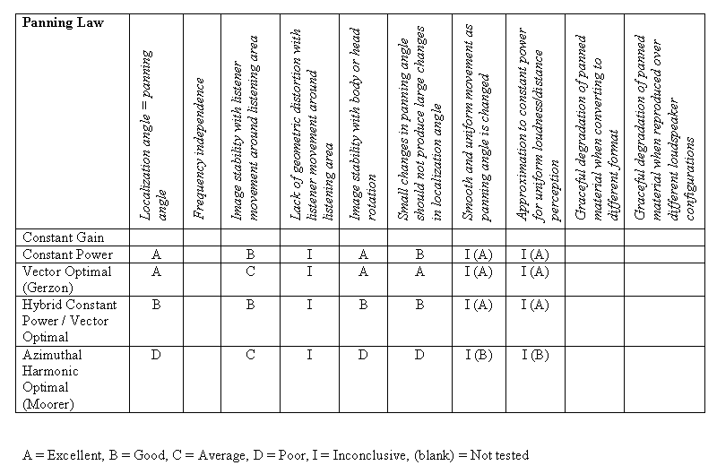 Table 4.10 summarizes the results of the listening tests by giving each algorithm a very coarse letter grade for each of the tested pan pot criteria.