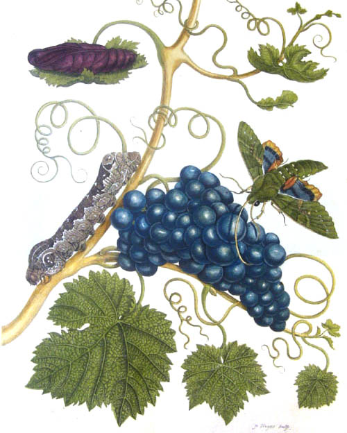 Metamorphosis insectorum Surinamensium. Of te verandering der Surinaamsche insecten. Waar in de Surinaamsche rupsen en wormen met alle des zelfs veranderingen, na het leven afgebeeld en beschreeven worden, zynde elk geplaast op die gewassen, bloemen en vruchten, daar sy op gevonden zyn; waar in ook de generatie der kirkvorschen, wonderbaare padden, hagedissen, slangen, spinnen en mieren werden vertoond en beschreeven, alles in America na het leven en levensgroote geschildert en beschreeven; pp. 1-60, pl. 1-60; Image from Francisco Welter-Schultes