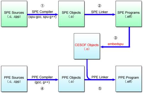 A special command called the embedspu command is used in Step (3) to generate the CESOF objects from the SPE programs. In Step (4), the PPE objects are generated from the source codes of the PPE program, and finally in Step (5), the PPE program is created by linking the CESOF objects and the PPE objects.