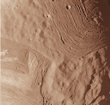 Miranda's surface is all mixed up with heavily cratered terrain intermixed with weird grooves, valleys and cliffs (one over 5 kilometers high; left).