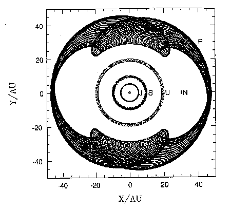 Here we see the z-component of each planet's position plotted against the simultaneous distance from the sun. Most planets only make small excursions in the vertical and radial directions, but Pluto executes a large, tear-shaped figure. This vertical projection shows that Pluto is far from being Neptune-crosser.