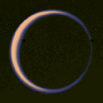 And yet our knowledge is frustratingly incomplete. Titan is surrounded by a thick, opaque atmosphere; the surface cannot be seen at all in visible light (below left). (The Cassini mission will map Titan's surface with radar as Magellan did at Venus.) All that the Voyager images show is a slight variation in color between the northern and southern hemispheres. Some surface detail is visible in the infrared with HST.
