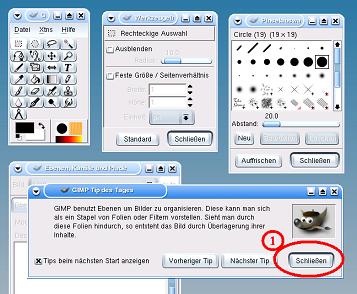 (1) Das "GIMP Tip des Tages"-Fenster schließen Sie mit einem Klick auf <Schließen>. |