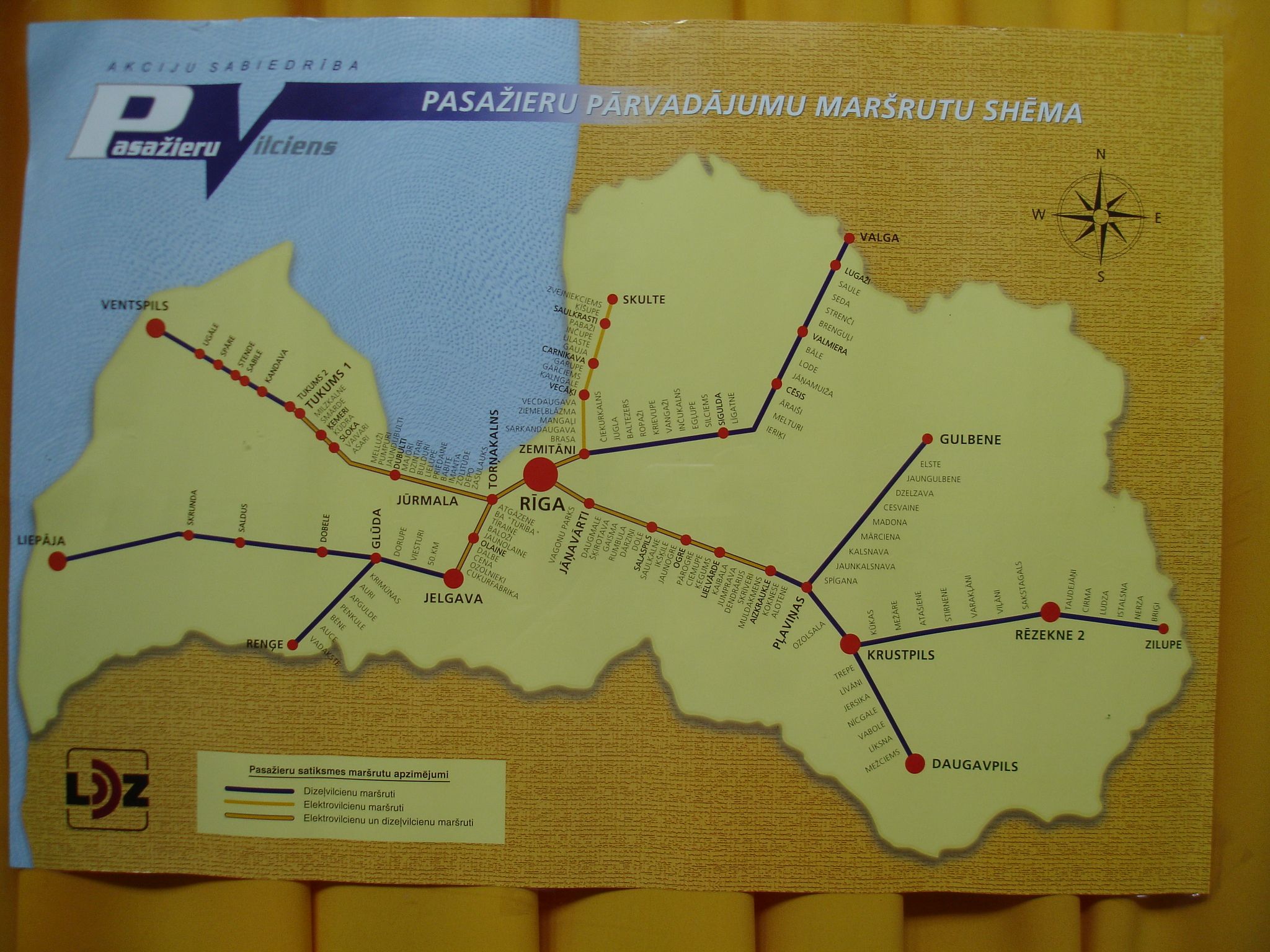 This is a very typical suburban service EMU train around Riga. These class ER2 trains were made by RVR in Riga during the Soviet times. The Latvians have already tried to buy more modern trains, but their public tendering resulted in litigation, so the 1960s style Soviet trains still continue their service. Picture of an ER2 unit at Salaspils station 1.4.2017 by Ilkka Siissalo. A schematic picture of the railways of Latvia in 2008. Picture by the Latvian state railways LDZ. The 33 km long narrow gauge line still in operation between Gulbene and Aluksne is missing from the picture. Click on the picture to see it in full scale.