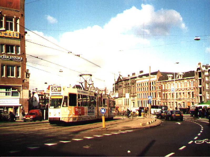 Amsterdam tram no.808 on line 20 at Muntplein. The "Achtasser" trams with two articulated joints were in use in Amsterdam