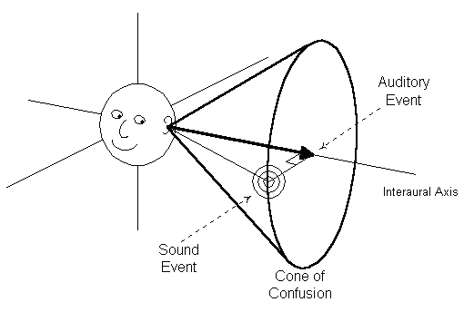 Later investigations of spatial hearing discovered that IIDs and ITDs do not explain localization sufficiently. In fact, they only affect the lateralization of the sound source, where lateralization is the perception of position along the interaural axis on the frontal plane. (The interaural axis can be conceptualized as a ray passing through both ears.) When signals presented to the ears have only IIDs or ITDs, listeners can describe the extent to which the signals are to their left or right, but not whether they are in front of, behind, above, or below them. Woodworth [16] called this ambiguity of location at a given degree of lateralization the "cone of confusion," as shown in Figure 2.5. It was given its name because all points that occur at the same distance from the left and right ears form a cone opening outward from each ear.