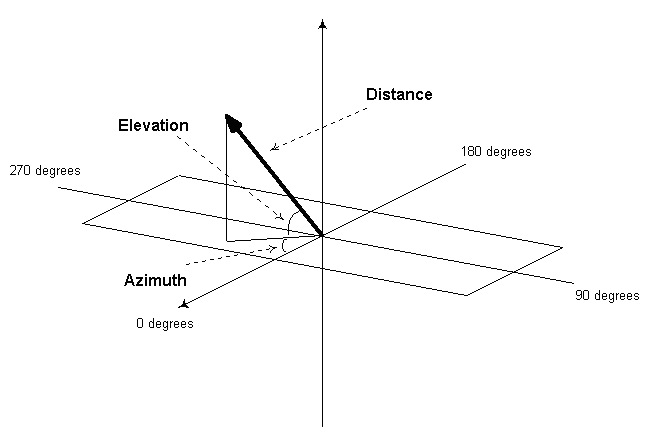 A vector describing the position of the sound source relative to the center of the listeners head is expressed in polar fashion as an azimuth, elevation, and distance. Figure 2.4 shows this localization vector. Azimuth is measured as an angle between a projection of the vector onto the horizontal plane and a second vector extending in front of the listener [16]. This second vector along the median plane usually is given as 0º, and azimuths are measured relative to this vector going counter-clockwise from 0º to 359º around the listeners head. (In this project, azimuth is the most important measurement because we are only concerned with localization of virtual sound sources from horizontally arrayed loudspeakers.) Elevation is measured as the angle between a third vector pointing forward in the horizontal plane (0º) and the height of the sound source. Here, 90º and -90º elevations are directly above and below the listener, respectively.